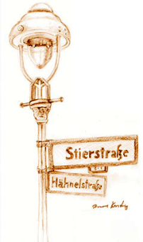 Das Haus Stierstraße/Hähnelstraße 6 wurde vor ein paar Jahren saniert & in Eigentumswohnungen umgewandelt. Zusätzliche Balkone, deren Eckpfeiler allerdings ein wenig streichholzartig wirken, wurden vor an der Stirnseite appliziert. Die therapeutische Praxisgemeinschaft hat uns im Vorgarten eine entzückende Rosengartenlaube beschert. Es rankt & blüht. In der zur Hähnelstraße gehörenden Hausseite verweile ich staunend vor einem Zauberreich, welches sich eine Metallbildhauerin geschaffen hat. Eigene Skulpturen & jüngst auch zwei an der Außenfront verankerte Gemälde. Aufwändige (im Design & in der Verarbeitung) metallene Tische, Stühle und Bänke(alle mit Edelhölzern komponiert) haben aus einem heruntergekommenen Vorgarten einen sorgfältig geplanten Platz gemacht. Von den Außenlampen bis zur Eingangspforte & Begrünung alles geschmackssicher modernistisch gestylt. Ein abgeschirmtes, gleichwohl nicht abweisendes Reich. Ich gratuliere!