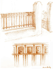 Nun sind wir schon bei „Hellas Bad“ angelangt (Eckhaus Stier-/Hähnelstraße). Relativ liebloser Vorgarten. Aber entschädigt werden wir durch die pagodenähnlichen Dachaufbauten. Im klassischen China waren die Dächer ein Symbol des Himmels. Mit unnachahmlich schwungvoller aber sanfter Bewegung wölbt es sich auch hier himmelwärts. Ein Hauch des fernen Ostens in Friedenau.