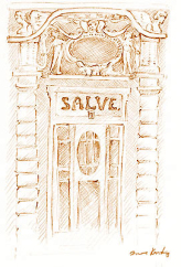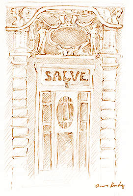 Nun weiter flaniert zu Nr. 9. Über der Eingangstür prangt ein weithin sichtbares „Salve“. Das altrömische „Sei gegrüßt!“. In dieser Straße ist fast jeder Eingang nicht nur Eingang. Es sind großartig gelungene Einladungen! Es sind Ermutigungen zu einem „aufrechten Gang“ von dem I. Kant sprach (Was ist Aufklärung). Triumphbogenartig umrahmen unterschiedlich behauene Steinquader den Eingangsbereich. Die Supraporte ist schwelgerisch. Zwei Grazien schwingen Girlanden und vieles, vieles mehr ist zu sehen. Verschwenderisch, jedoch keinesfalls schwülstig.
