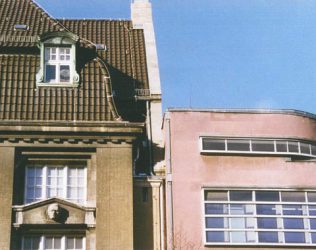 Dieses eindrucksvolle Farbfoto ist 2002 entstanden. Ein Beispiel vorzüglicher Architekturfotografie. Es knistert gerade voll Spannung. Zwei benachbarte Gebäude – ein jedes für sich würdig und prägnant – prallen aufeinander. Dem linken und dem rechten Gebäude – durch die hochragende Brandmauer scharf getrennt – wird man jeweils auch eine Eleganz beziehungsweise einen ausgeprägten Stilwillen bescheinigen dürfen. Indem sich der Fotograf mit konzentriertem Blick architektonischen Teilstücken zuwendet, kontrastiert und verdeutlicht er. Er schärft unsere Wahrnehmung durch Weglassen.