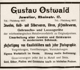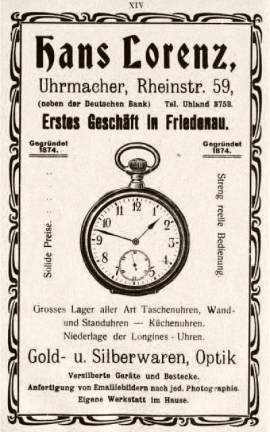 Der mit Abstand älteste Traditionsbetrieb, der noch heute in der fünften Generation als Leuchtturm Bestand hat, befindet sich in der Rheinstr. 58/59 (ein paar Schritte aus dem Bogen-Plan herausgetreten). Ein Familienunternehmen mit Weltanschauung, so sagt es vollmundig das Selbstporträt von 1996. Wenn für den Klempner Gas, Wasser, Scheiße gilt, so bleibt für Lorenz Gold, Uhren, Perlencolliers & Eheringe der Dauerbrenner. Da die Firma in fast jedem Friedenaubuch sich selbst feiert bzw. gefeiert wird, erspare ich mir weitere Ausführungen. (Bin auch kein Rolex-Typ). 1913 allerdings hatte die Firma noch Konkurrenz. Direkt gegenüber vom ersten Geschäft in Friedenau residierte ein Gustav Ostwald: