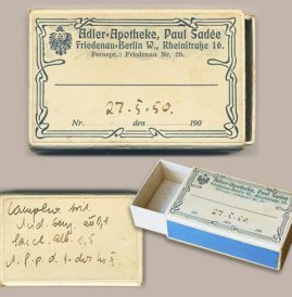 Dieses handgearbeitete Pillenschächtelchen, geziert mit dem reichsdeutschen Kaiseradler wurde noch (siehe Aufschrift per Hand) anno 1950 an Kunden/ Patienten ausgegeben. Nach Weltkrieg I, Inflation, Weltkrieg II, Besatzung, Gründung der BRD/DDR. Selige Insellage Berlin-West: Kaiserreiche & Systeme kommen & gehen, nützliche Schächtelchen bleiben bestehen. Ein anrührender wie seltener Kontinuitätsbeitrag wird hier geliefert! Museumswürdig! In Treue fest zum harmlos dienenden Ding.