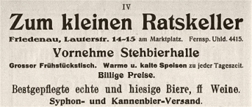 Auch ist den Meisten sicher noch Der kleine Ratskeller geläufig. Jeder der am Breslauer Platz flanierte und am Markttrubel teilnahm (wer eigentlich nicht?) wird ihn noch bis hinter der Jahrtausendwende wahrgenommen haben. Zumindest von außen. Schon vor Wochenmarkt – Schluss war er gerammelt voll. Manch Standbetreiber ging auch schon mal zwischendurch einen zischen. Manch Ratskellerbesucher wartete sonnabends darauf, bis das Abräumen draußen angesagt war und sorgte, leicht angegangen, für ein volles Netz verbilligter Ware. Man kannte sich und jeder hatte seinen lütten Gewinn. Nun habe ich die Ehre, allen Friedenauer Trunkenbolden & Gelegenheitssüffeln diese altehrwürdige Erinnerung an eine verschwundene Wirkungsstätte zu widmen: