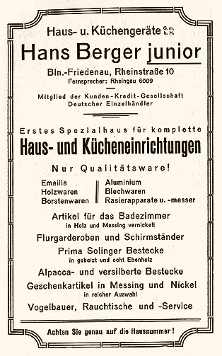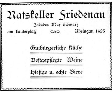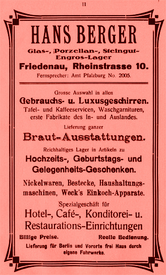 Die nächste Anzeige wurde 1927 gedruckt, dies ist schon daran erkennbar, weil erst in den zwanziger Jahren das einheitliche Rheingau-Fernmeldeamt für Friedenau installiert wurde. (vor dem 1. Weltkrieg waren unter anderem Uhlandstraße, Pfalzburg amtlich vermittelt)