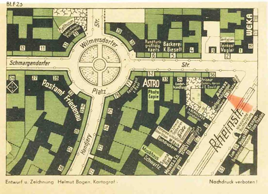 Wir sind ja heute googlemap verwöhnt und gemästet und können nach Belieben jeden Hinterhof der Welt ausspionieren (was noch vor nicht allzu langer Zeit einer strengsten Militärgeheimhaltung unterlag). Alles zum beamen und der Stecknadel freigegeben. Hier fehlt das Dreidimensionale! Allerdings sollte über der googleeinheitlichen Weltstandardkartographie nicht der Charme älterer und alter Gestaltungsweisen vergessen werden. Hat dieses DIN A 5 Blättchen nicht auch seinen spezifischen Reiz und Erkenntnisgewinn? Der Kartograf Helmut Bogen (ich konnte leider über ihn nichts mehr ermitteln), der für diesen Entwurf und Zeichnung steht, hat möglicherweise in seiner handwerklichen Klarsprache mehrere Friedenaublätter geschaffen (siehe am obigen Rand das Kürzel Bl.F23). Falls es sich bei F um Friedenau handelt, kann man nur hoffen, dass weiteres auftaucht. Ein Profi war er gewisslich! Eines hat der Meister aber sträflichst vernachlässigt: Er hat seine Werke nicht datiert.