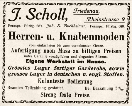 Die historischen Anzeigen, die im Folgenden vermehrt eingeblendet werden, sollen den Flickenteppich des Wandels und der Kontinuität illustrieren. Sie sollen exemplarisch verdeutlichen und ergötzen, indem sie Vergangenheiten verlebendigen und Flüchtiges festnageln. Auf dem Bogen-Kärtchen sind im Vorderhaus der Rheinstr. 9 Mewes & Co. Damenmoden platziert, im Kaiserreich hingegen sind Herren- & Knabenmoden hier beheimatet: