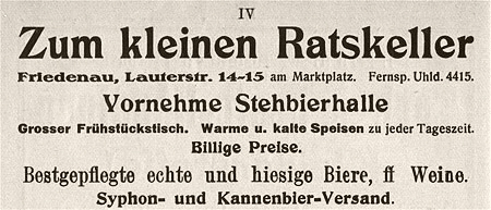 Eine gewisse Witzigkeit sehe ich auch darin, dass der kleine Ratskeller sich so benamst hat, bevor der Grundstein zum Altmanschen Friedenauer Prachtbau gelegt wurde. Die fand erst am 14. Oktober 1913 aus Anlass des 100sten Jahrestages der Völkerschlacht zu Leipzig statt. (Salute! Demnächst vor100 Jahren) Der Gebäudekomplex wurde erst im Kriegsjahr 1917 fertig gestellt. Allerdings wurde der öffentliche Wirts- und Geselligkeitsort bereits am 23. Dezember 1915 eingeweiht, mit Bums und Bier. Im Oktober 1916 wurde daselbst – dies ist ausführlich beschrieben – über die zu schaffende Ortsfahne der Gemeinde Friedenau gestritten. Als Farbe wurde blau vorgeschlagen. Ein Gemeindevertreter unterstrich diese Forderung mit dem Hinweis darauf, dass im Ratskeller schon mancher Einwohner blau geworden sei. Dem wohlgesetzten Bürgermeister Walger kam diese Einrede krähwinklich vor. Jedoch, eine blaue Fahne wurde beschlossen.