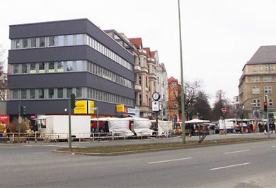 Das Büchl ist zugeklappt und wir biegen nun von der hinter dem Breslauer Platz beginnenden Rheinstraße rechts ab und in die Schmargendorfer Straße ein. Sie führt zum René Sintenis Platz und wird von vielen benutzt, die entweder zur Post oder zur U-Bahnstation Friedrich Wilhelm Platz wollen.
