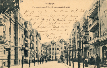Am 14. April 1905 gab Amtsvorsteher Schnackenburg bekannt, daß die bisherige Straße 11, die Verbindung zwischen Stubenrauch- und Wilhelmstraße (Görresstraße), den Namen Eschenstraße erhalten hat, benannt nach der Pflanzengattung Eschen (Fraxinus). In der Tat sind auf dem um 1910 entstandenen Foto frisch gesetzte Bäume abgelichtet. Der Anlieger G. W. wunderte sich jedoch bereits am 15. Mai 1905 über die Benennung, denn in der Straße befindet sich nicht eine einzige Esche und die Bepflanzung der Straße mit Eschen wird bei der geringen Breite des Bürgersteiges wohl kaum möglich sein. Dem Bürger muß allerdings widersprochen werden, denn nach dem Berliner Baum-Kataster des Jahres 2024 stehen dort 23 gewöhnliche Eschen (Fraxinus excelsior) mit einer Höhe von 9 mit 17 Metern.