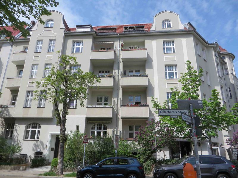 Das Haus wird in der Landesdenkmallste leider nicht erwähnt, obwohl sich Max Pechstein ein damals verbotenes Dachatelier eingerichtet hatte, das ich freilich nur mit dem Notwendigsten versehen konnte. Ich hatte in diesem einen Raum die Wände mit Nessel bespannt und ringsherum von oben bis unten mit Stoff-Farben bemalt, so dass das Fehlen der Möbel kaum auffiel. Die Unterkukunft war illegal und so kommt es, daß die Offenbacher Straße Nr. 1 unter den Berliner Wohnorten von Pechstein nicht auftaucht. Seine Wandbespannung ist erhalten und lagert in der Nationalgalerie.