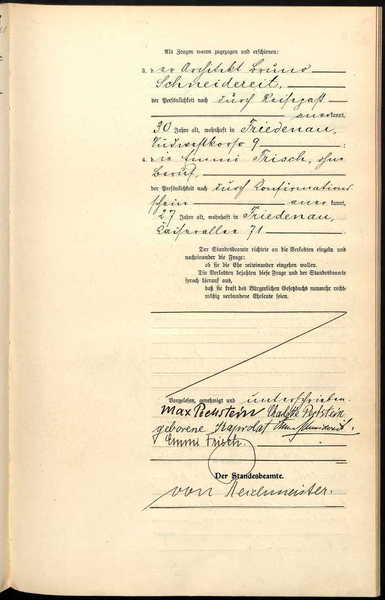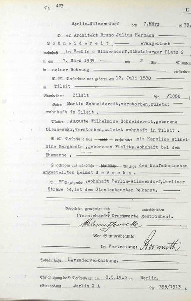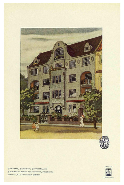 Am 8. Mai 1913 erschienen vor dem Standesamt Berlin zum Zwecke der Eheschließung 1. der Architekt Bruno Schneidereit, evangelischer Religion, wohnhaft in Berlin-Friedenau, Taunusstraße Nr. 23, und 2. die Karolina Wilhelmine Margarete Fielitz, evangelischer Religion, geboren am 25. April 1887 zu Berlin, wohnhaft in Berlin, Brunnenstraße Nr. 191, Tochter des verstorbenen Fabrikbesitzers August Karl Gustav Adolf Fielitz und seiner verstorbenen Ehefrau Pauline Wilhelmine geborene Wasewitz. Bereits im Oktober 1910 hatte die Zeitschrift Deusche Kunst und Dekoration eine Farbzeichnung veröffentlicht – betitelt mit Wohnhaus. Friedenau. Taunusstraße. Architekt: Bruno Schneidereit, Friedenau. Maler: Max Pechstein, Berlin.