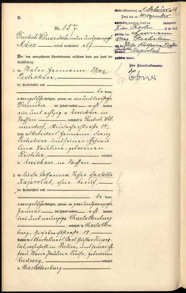 Damit verzögerte sich die Fertigstellung von Schneidereits Häusern Offenbacher Straße Nr. 1 und Nr. 8, in dem Max Pechstein zu günstigen Konditionen Wohnung und Atelier als Lohn für seine Dekorationen zugesagt worden war. Pechstein war in Bredouille. Am 29. März 1911 hatte er auf dem Standesamt Wilmerdorf Charlotte Kaprolat (1893-1965) geheirat und war nun ohne Bleibe. Mit Billigung von Bauherrn Bruno Schneidereit richtete Pechstein ein damals verbotenes Dachatelier in der Offenbacher Straße Nr. 1 ein, das ich freilich nur mit dem Notwendigsten versehen konnte. Ich hatte in diesem einen Raum die Wände mit Nessel bespannt und ringsherum von oben bis unten mit Stoff-Farben bemalt, so dass das Fehlen der Möbel kaum auffiel. Der Kunsthistoriker Eduard Plietzsch berichtete, daß die Rückseite des Haus an den Friedhof stieß, so dass wir nachmittags immer die Beerdigungsmusik, die von unten heraufscholl, bei unseren Unterhaltungen mitgenießen konnten. Die Unterkunft war illegal und so kommt es, daß diese unter den Berliner Wohnorten von Pechstein nicht auftaucht. Seine Wandbespannung ist erhalten und lagert in der Nationalgalerie.