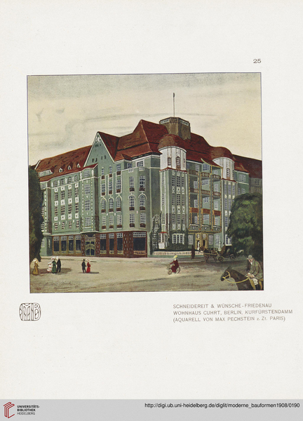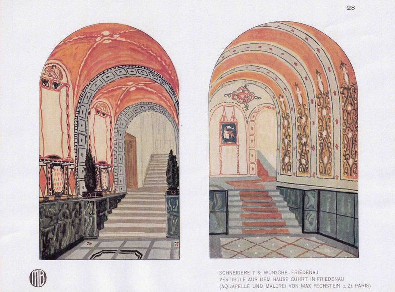 Schneidereit erinnerte sich an die Kunstgewerbeausstellung Dresden 1906 und an die Glas- und Wandmalereien sowie Mosaiken des Akademiestudenten Max Pechstein (1881-1955), die dieser zur Finanzierung seines Studiums für seine Professoren ausgeführt hatte. Im August 1908 war Pechstein in Berlin, bekam ein Dachatelier im Haus und machte sich an die Dekoration. Am 17. September schrieb er Schmidt-Rottluff: Ich habe mich jetzt endlich soweit eingerichtet. Der ganze Sommer ist wieder einmal für andere draufgegangen, ohne dabei einen Verdienst erzielt zu haben, der einzige ist, ich wohne umsonst, immerhin was. So ganz korrekt war das nicht, denn Bruno Schneidereit sorgte für publicity. In Moderne Bauformen erschien ein farbiger Entwurf: Schneidereit & Wünsche, Friedenau, Wohnhaus Curth, Berlin, Kurfürstendamm, Aquarell von Max Pechstein. Erwähnt wurde der Putz, ein neues Material ‚Terrasit‘, ein Gemisch aus naturfarbenen gemahlenen Steinen, in diesem Falle Muschelkalk und Porphyr. Die Monatshefte für Architektur und Raumkunst veröffentlichten Innenansichten von Vestibül und Empfangsräumen sowie Ölgemälde der Familie von Max Pechstein.