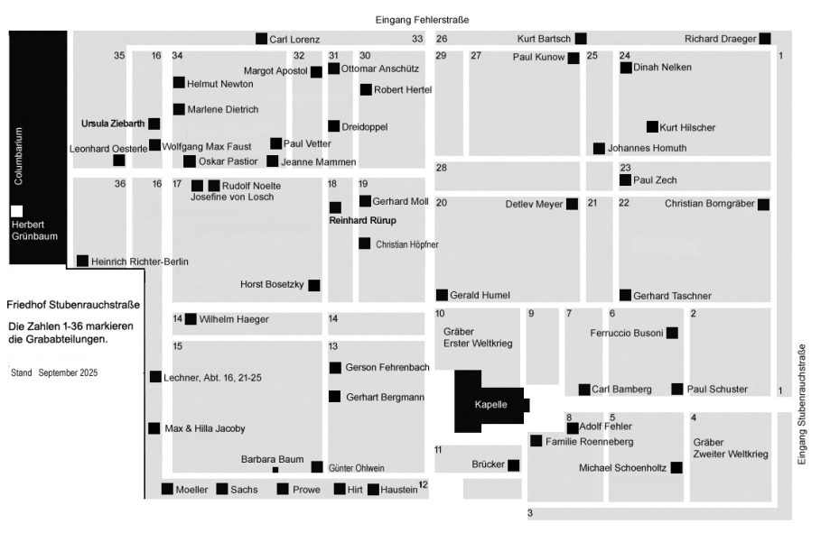 auf Grund der beschränkten technischen Möglichkeiten dieser Webseite gestaltet sich die Suche nach einzelnen Gräbern etwas mühsam. Sie finden unter Friedhof Stubenrauchstraße eine zweite Rubrik mit Namen und Beiträgen zu den dort beigesetzten Persönlichkeiten. Wir bitten um Verständnis.