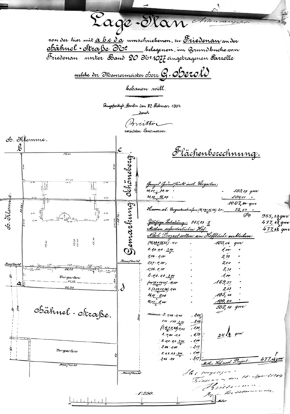 Den Friedenauer Bebauungsplänen von 1903 und 1910 sowie dem Übersichtsplan der Stadt Schöneberg von 1909 ist zu entnehmen, daß zwischen den Häusern Hähnelstraße Nr. 1 und Hähnelstraße Nr. 2 eine Baulücke eingezeichnet ist, die zum Grundstück Nr. 1 gehört. Ersichtlich ist auch, daß Nr. 2 mit zwei Seitenflügeln errichtet wurde. Zwischen Nr. 1 und Nr. 2 existierte eine Baulücke, ein sogenannter Bauchwich, jene Abstandsfläche, die bei der Bebauung zwischen zwei benachbarten Gebäuden freizuhalten war, um ausreichende Belichtung, Belüftung und Brandschutz zu sichern. Auf Grund der immer wieder geänderten Bauordnungen für Berlin und seine Vororte von 1887, 1892 und 1903 kann davon ausgegangen werden, daß zwischen Nr. 1 und Nr. 2 ein Abstand vorgeschrieben wurde.