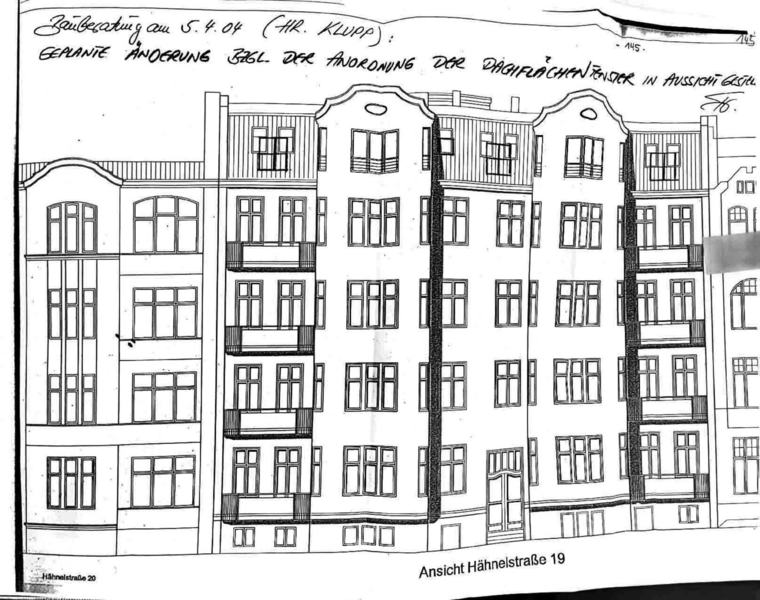 Die Geschichte des Mietshauses Hähnelstraße Nr. 19 ist ab 9. Februar 1904 in der Bauakte der Amtsverwaltung Friedenau dokumentiert. Da hatte der Maurermeister Gustav Herold die Pläne für den Bau eines viergeschossigen Vorderhauses mit zwei kurzen Seitenflügeln eingereicht: Lageplan, Grundrisse, Schnitt – vor allem aber beeindruckende, fein ausgearbeitete Details der Fassade. Da hatte ein Handwerker die Wirkung von Altan, Attika, Balustrade, Fries, Lisenen und Pilastern für die Gliederung von Wandflächen erkannt.