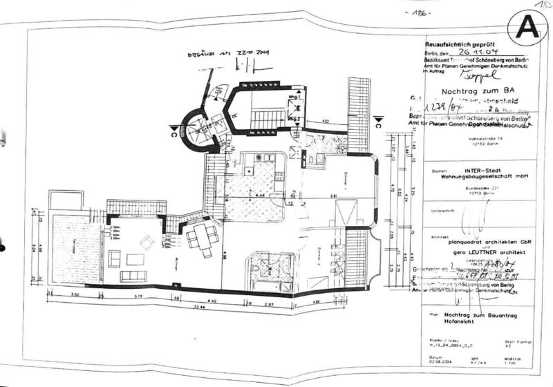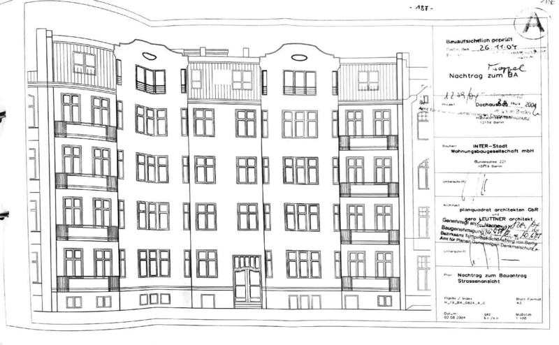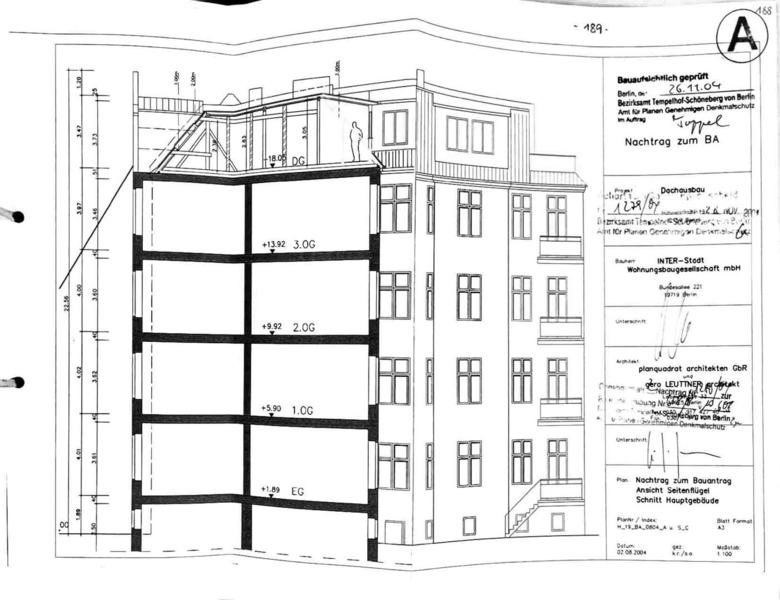 Bereits im August 2004 merkte das Schöneberger Amt für Planen, Genehmigungen und Denkmalschhutz an: Die Aufmauerung des Erschließungsgangs zur östlichen Wohnung widerspricht unseren Vorgaben für Dachausbauten, die Aufmauerungen im Dachbereich ausschließen und stattdessen für Fenster, Dachterrassen und Gauben zur besseren Einfügung in das bestehende Dach eine allseitige Einfassung mit mehreren Reihen Dachziegeln vorsehen, um den Dachbereich im Kontrast zu den darunter liegenden Vollgeschossen klar als Dach und oberen Abschluss eines Gebäudes zu erhalten.