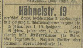 Laut Adreßbuch waren 1906 acht Mietparteien eingezogen, darunter der Mieter von Parterre links, der im Friedenauer Lokal-Anzeiger zum 1. April zur Beaufsichtigung von Kindern tagsüber ein junges, zuverlässiges Mädchen suchte. 1907 ging das Anwesen an den Kaufmann Reimann. Er offerierte hochherrschaftliche Wohnungen mit Heizung und Warmwasserversorgung, 5 Zimmer per 1.10. Hochparterre und 6 Zimmer 1. Etage sofort oder ab 1.10., ebenda helle Kelleräume für Büro- oder Lagerzwecke. So weit, so gut.