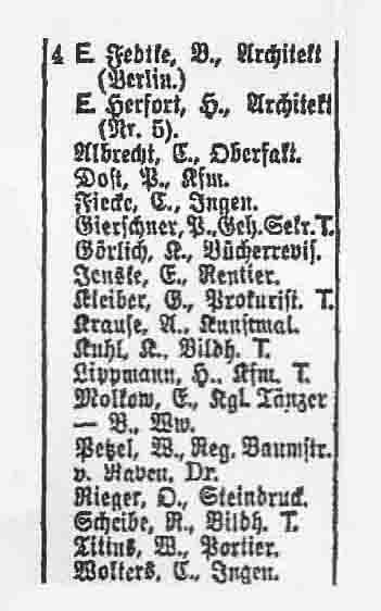 Kurz danach erwarben die Architekten Benno Fedtke und Hugo Herfort das Grundstück Nr. 4. Ein Jahr später waren die ersten Mieter eingezogen. 1913 war das Haus mit 19 Parteien vollständig bezogen, darunter der Kunstmaler A. Kause und der Bildhauer K. Kuhl. 1914 folgte Bildhauer Richard Scheibe.