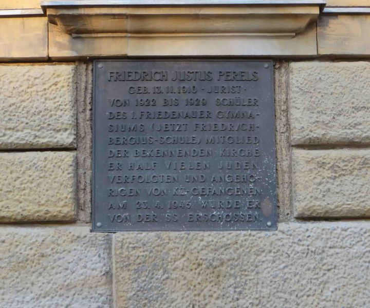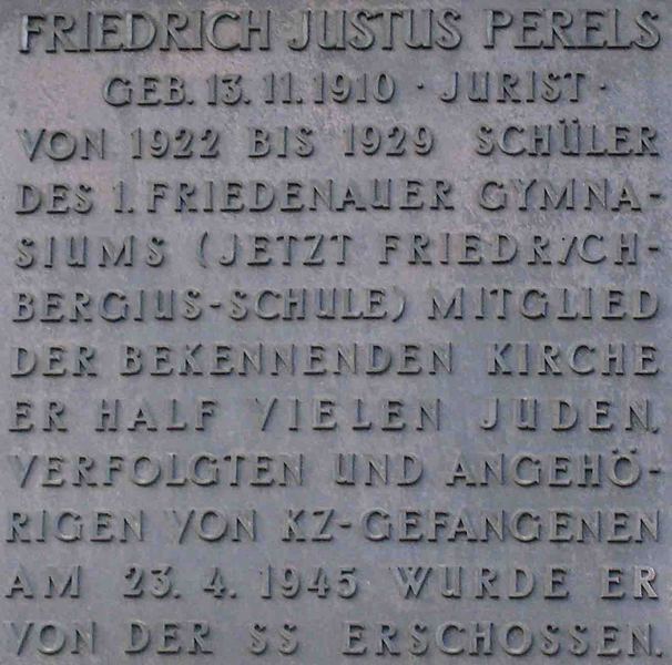 Der Platz vor seinem Gymnasiums heißt seit 1. Oktober 1961 Perelsplatz. Am Gebäude wurde eine Gedenktafel angebracht: Friedrich Justus Perels, geb. 13.1.1910, Jurist.Von 1922 bis 1929 Schüler des 1. Friedenauer Gymnasiums (jetzt Friedrich-Bergius-Schule). Mitglied der Bekennenden Kirche. Er half vielen Juden, Verfolgten und Angehörigen von KZ-Gefangenen. Am 23.4.1945 wurde er von der SS erschossen.