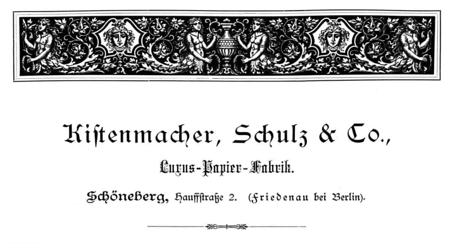 In diesem ‚Friedenauer‘ Teil Schönebergs liegt, inmitten eines reizenden Villenviertels unmittelbar an der Grenze von Friedenau, zwischen schattigen Alleebäumen, blühendem Gebüsch und prächtigen Baumgruppen versteckt, in der Hauffstraße Nr. 2 die Luxus-Papierfabrik von Kistenmacher, Schultz & Co. Sie gehört in kommunaler Beziehung zu Schöneberg, wohin sie auch ihre Steuern entrichtet; sie ist aber als in Friedenau sesshaft eingetragen, wird von Friedenau aus postalisch bedient und bezeichnet deshalb in ihren sämtlichen Geschäftskundgebungen Friedenau als Sitz der Firma.